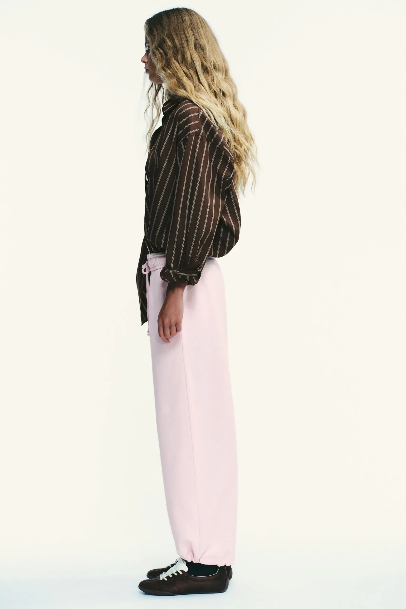 Trousers made from cotton. High waist with an elasticated waistband that can be adjusted with drawstrings. Side pockets concealed in the seam. Hem adjustable with elasticated drawstring and stoppers.