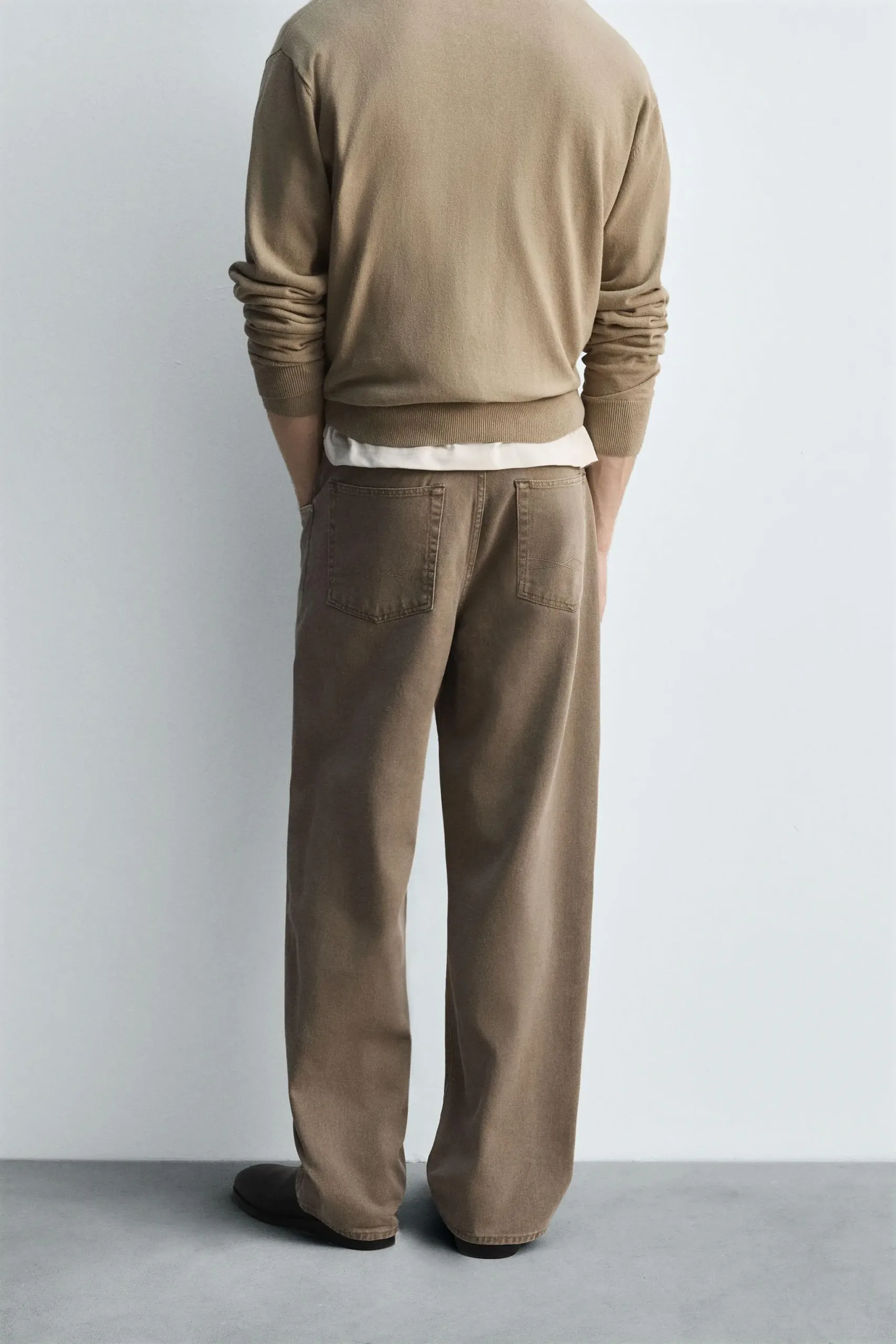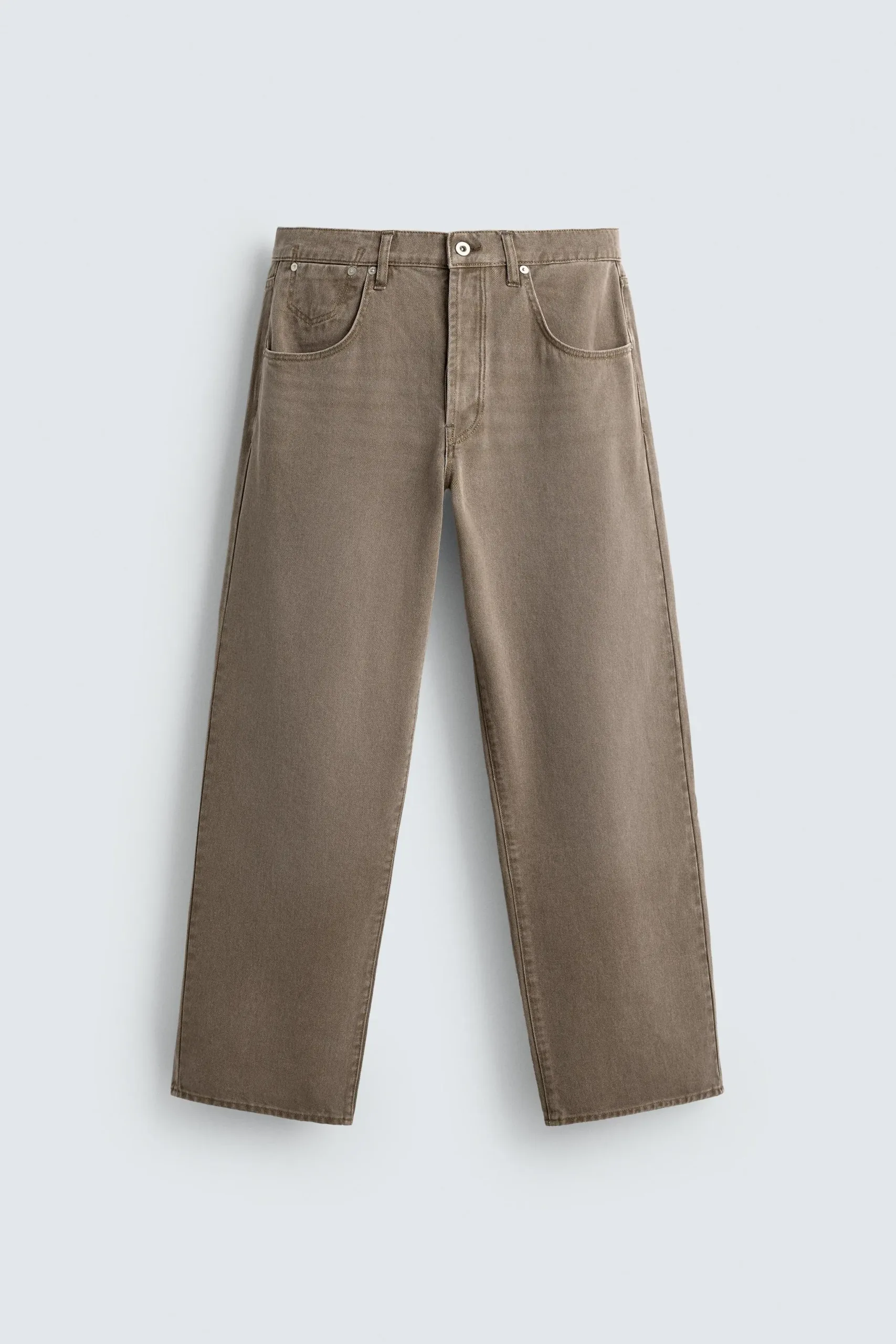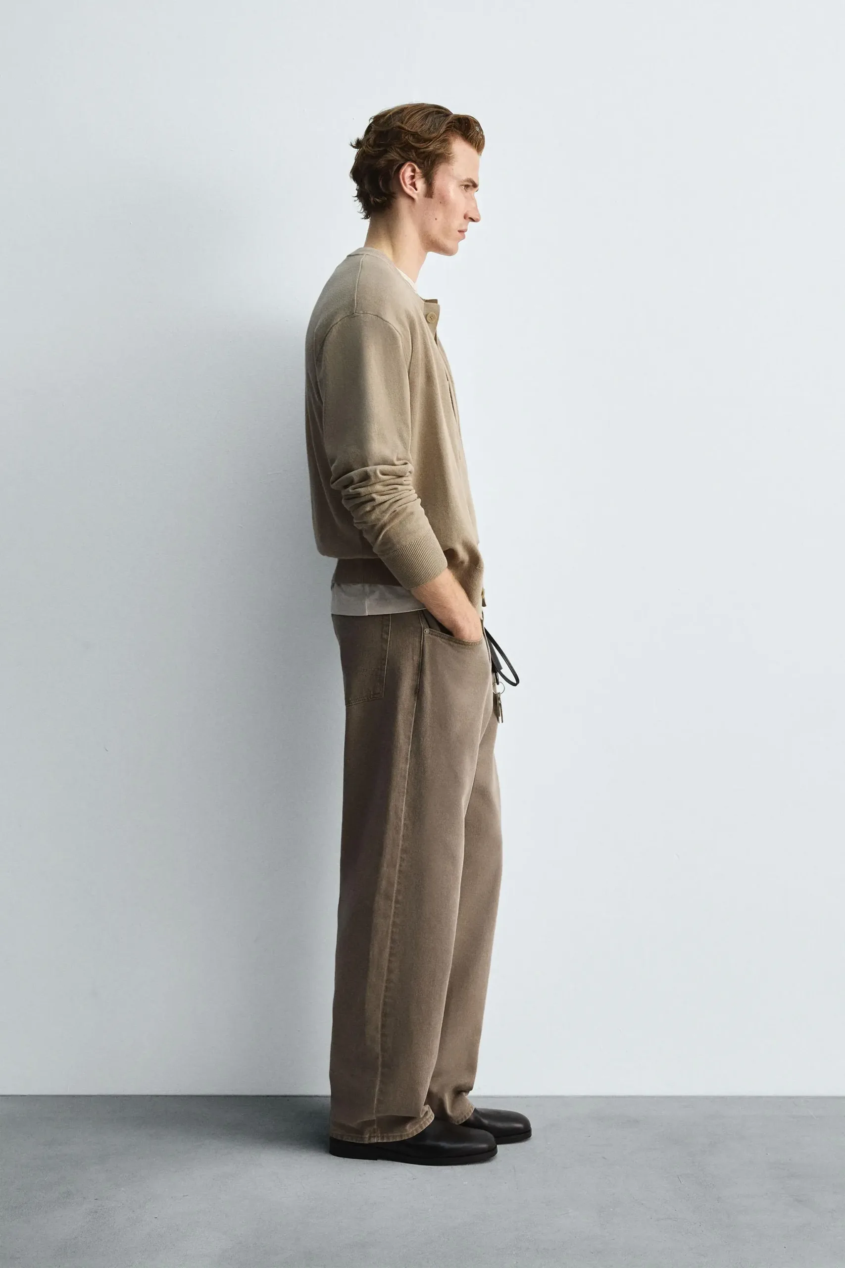 Barrel fit jeans made of cotton denim. Five pockets. Washed effect. Button fly fastening.