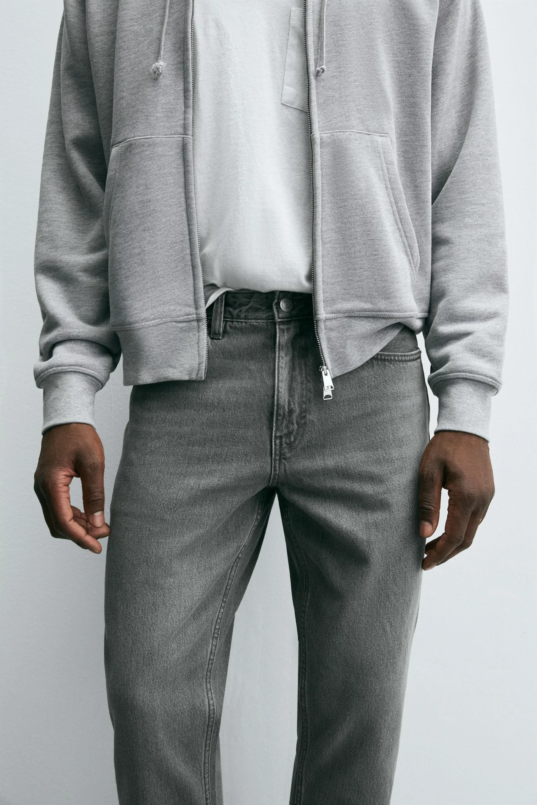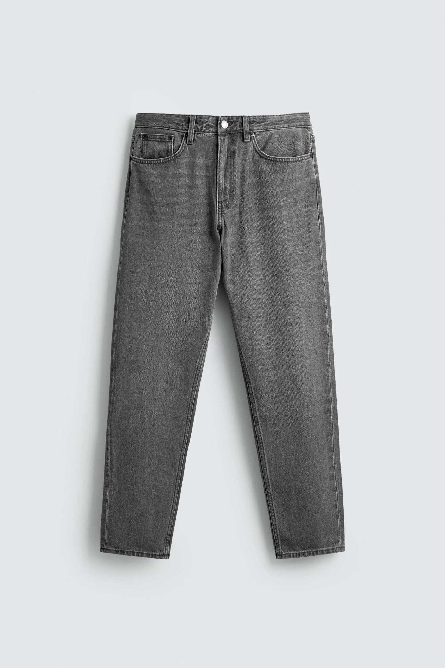 Slim fit tapered jeans. Five pockets. Faded effect. Zip and button front fastening.